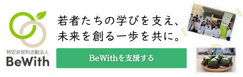 BeWithは、誰もが気軽に訪れ、支え合える温かな居場所をつくることで、若者の成長を応援し、地域全体で未来を支える社会の実現を目指しています。