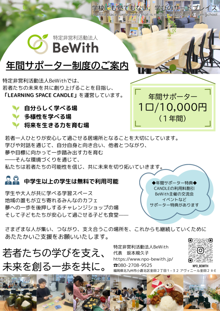 BeWithは、若者・学生が安心して集い、挑戦できる居場所づくりに取り組んでいます。